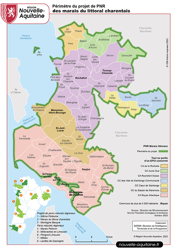 La création d’un Parc naturel régional a été initiée en 2016 par trois intercommunalités : les Communautés d’Agglomération Rochefort Océan et Royan Atlantique et la Communauté de Communes du Bassin de Marennes, en partenariat avec la Région Nouvelle-Aquitaine.