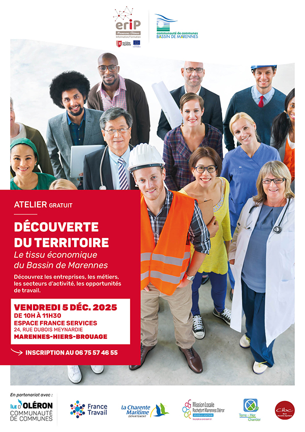 Les Communautés de Communes du Bassin de Marennes et son Espace Régional d’Information de Proximité (ERIP) proposent aux personnes en recherche d’activité professionnelle, un atelier gratuit pour découvrir le tissu économique et les opportunités de travail sur le Bassin de Marennes et ses alentours.